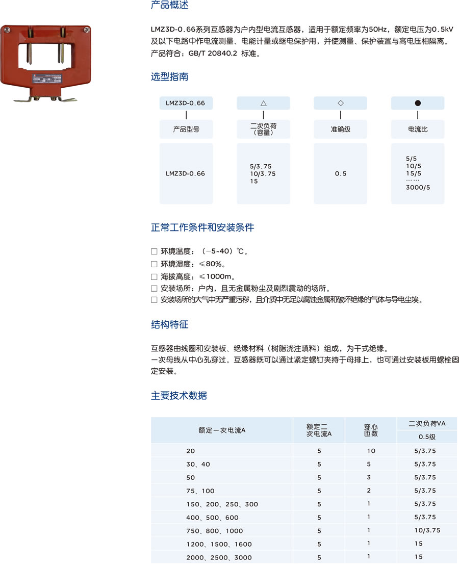 LMZ3D-0.66系列互感器为户内型电流互感器,适用于额定频率为50Hz,额定电压为0.5kV及以下电路中作电流测量、电能计量或继电?;び?,并使测量、?;ぷ爸糜敫叩缪瓜喔衾搿? 产品符合:GB/T20840.2标准。