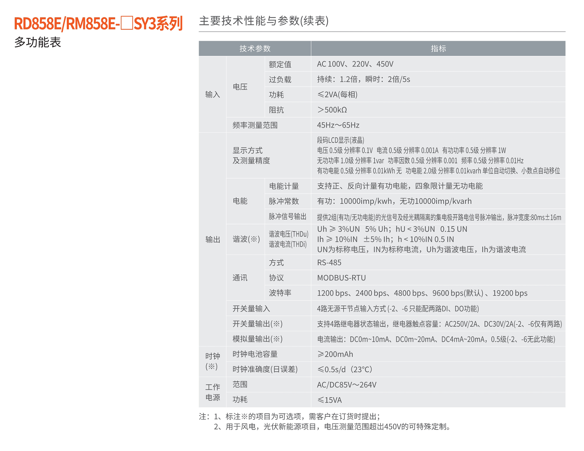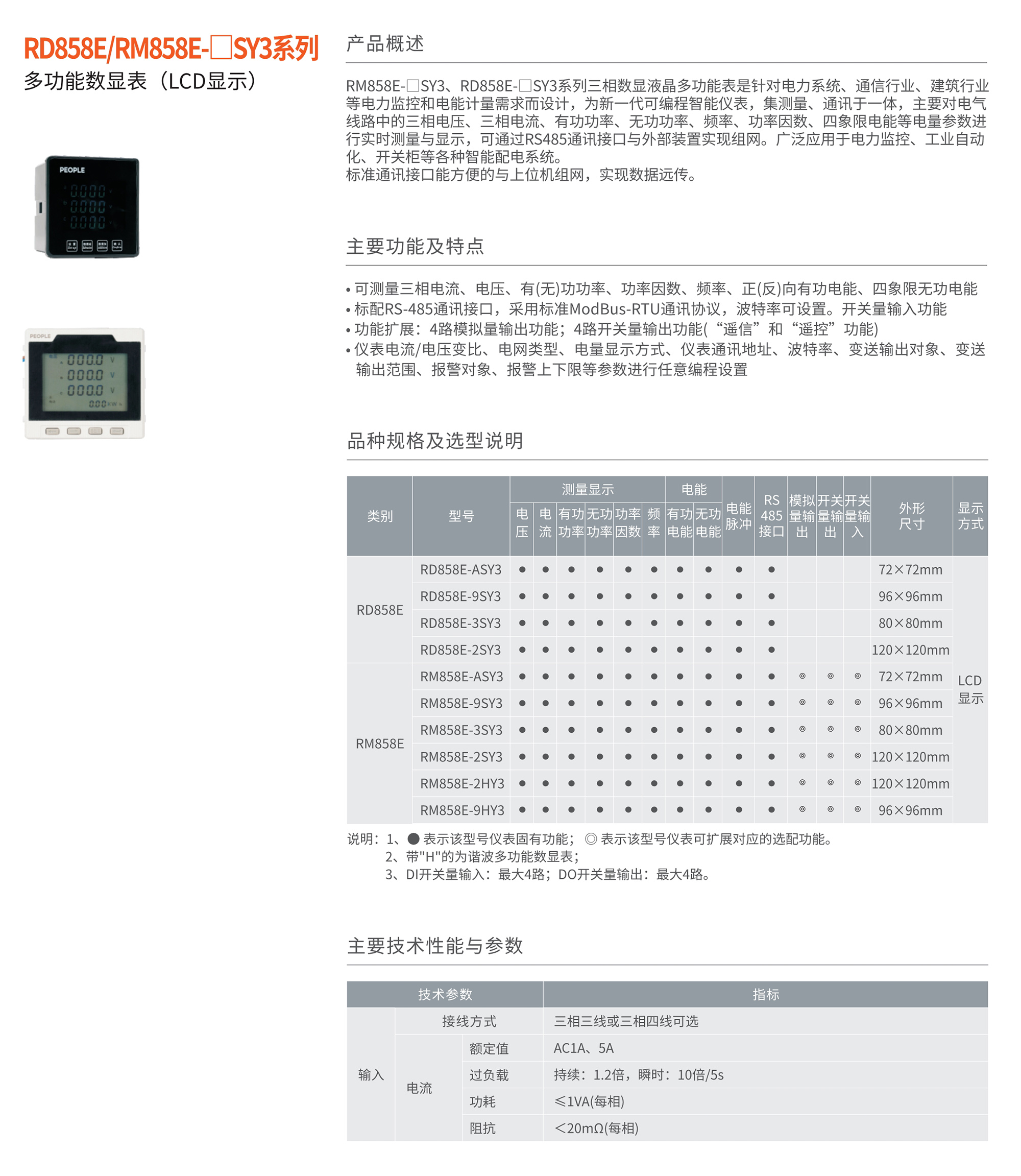 RM858E-□SY3、RD858E-□SY3系列三相数显液晶多功能表是针对电力系统、通信行业、建筑行业等电力监控和电能计量需求而设计,为新一代可编程智能仪表,集测量、通讯于一体,主要对电气线路中的三相电压、三相电流、有功功率、无功功率、频率、功率因数、四象限电能等电量参数进行实时测量与显示,可通过RS485通讯接口与外部装置实现组网。广泛应用于电力监控、工业自动化、开关柜等各种智能配电系统。标准通讯接口能方便的与上位机组网,实现数据远传。