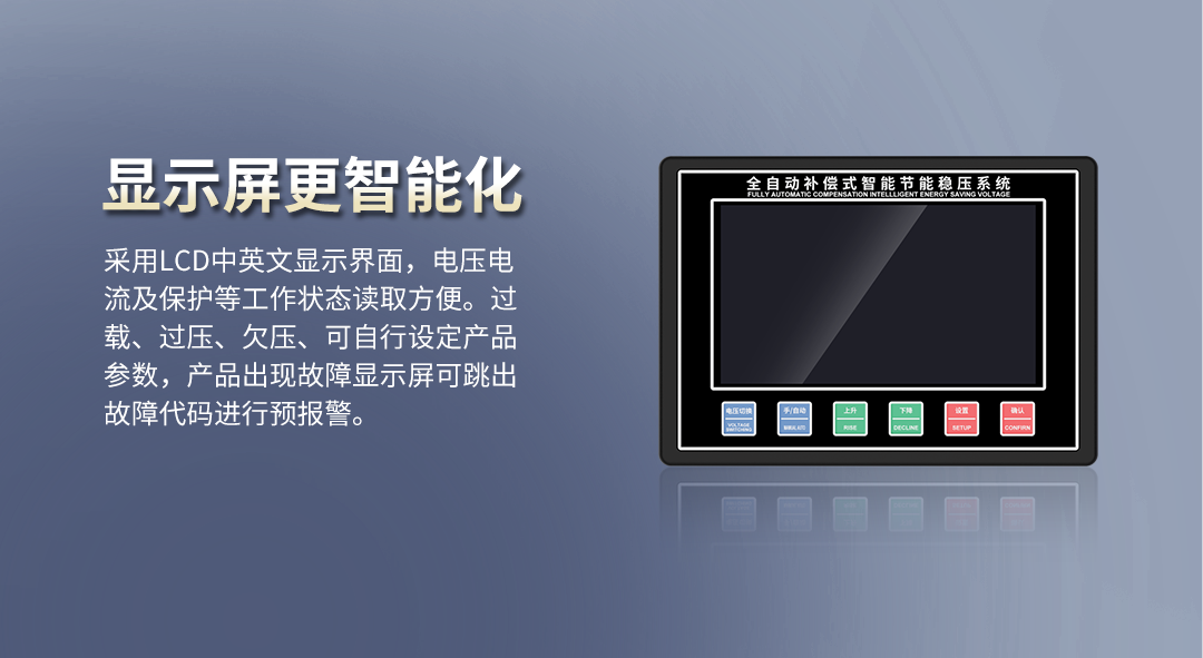 采用LCD中英文显示界面,电压电流及?;さ裙ぷ髯刺寥》奖?。过载、过压、欠压、可自行设定产品参数,产品出现故障显示屏可跳出故障代码进行预报警。